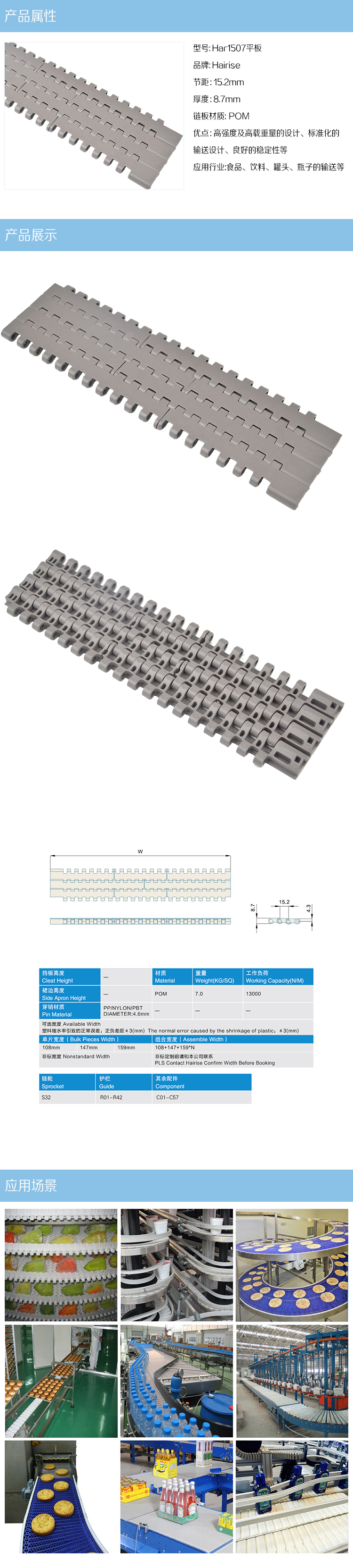 输送带材质一般有聚甲醛(POM)、聚丙烯(PP),结构形式有水平直线输送、水平转弯输送、提升爬坡输送等形式,