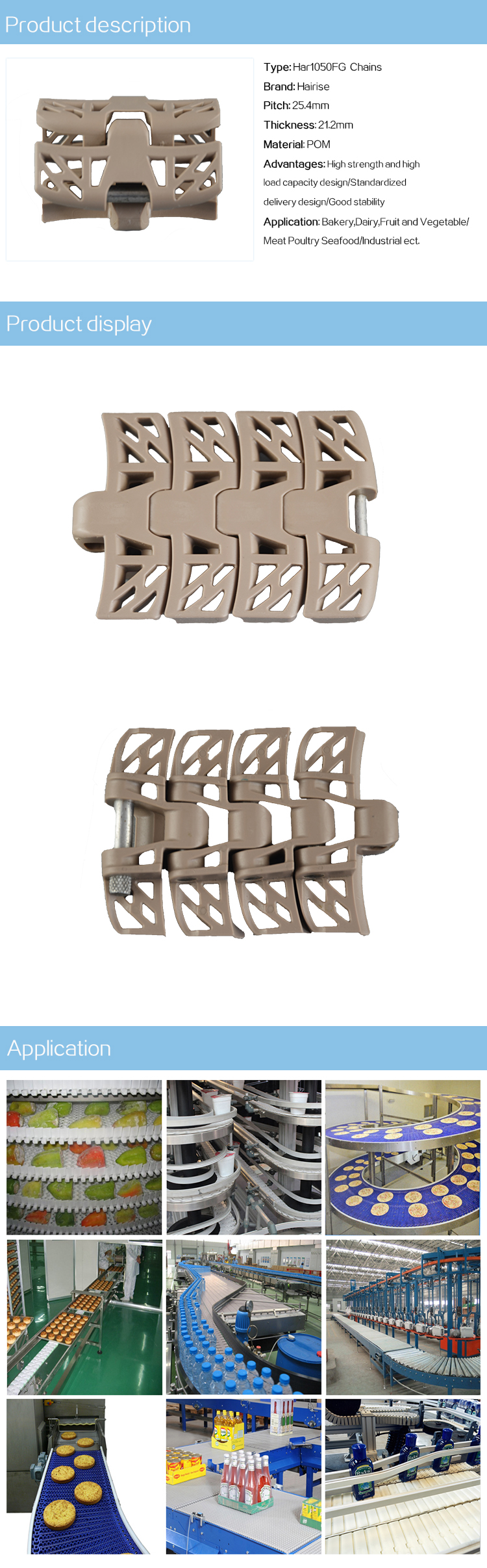 Marca: Hairise Paso: 25,4 mm Espesor: 21,2mm Área abierta: 10% Pin: Acero inoxidable Material: POM Color: Blanco / azul/Marrón o personalizado